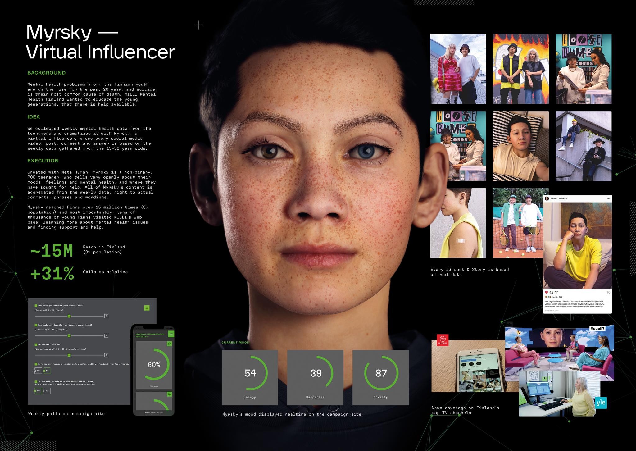 The Finnish Red Cross (Suomen Punainen Risti) has taken an innovative step to reach the youth who struggle with anxiety, depression, and stress. They introduced the virtual influencer Myrsky on Instagram. The primary objective is to ensure that the youth feel heard, seen, and supported without judgment. They believe this AI approach would create non-judgmental conversations. This creative approach created by Bob The Robot has proven how organizations can adapt to digital trends to reach the youth where they are most comfortable.